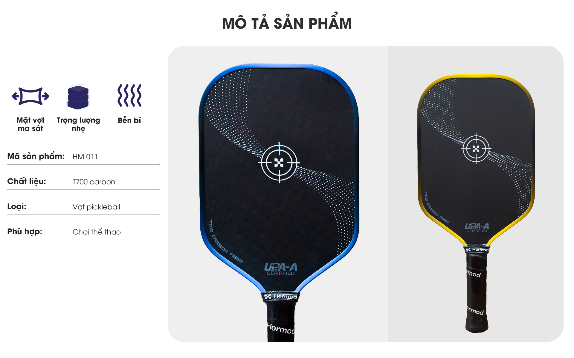 Mỗi gam màu của HM011 đại diện cho một phong cách thi đấu riêng – từ mạnh mẽ, quyết đoán đến tinh tế và linh hoạt – sẵn sàng đồng hành cùng mọi tay vợt trên hành trình chinh phục sân đấu.