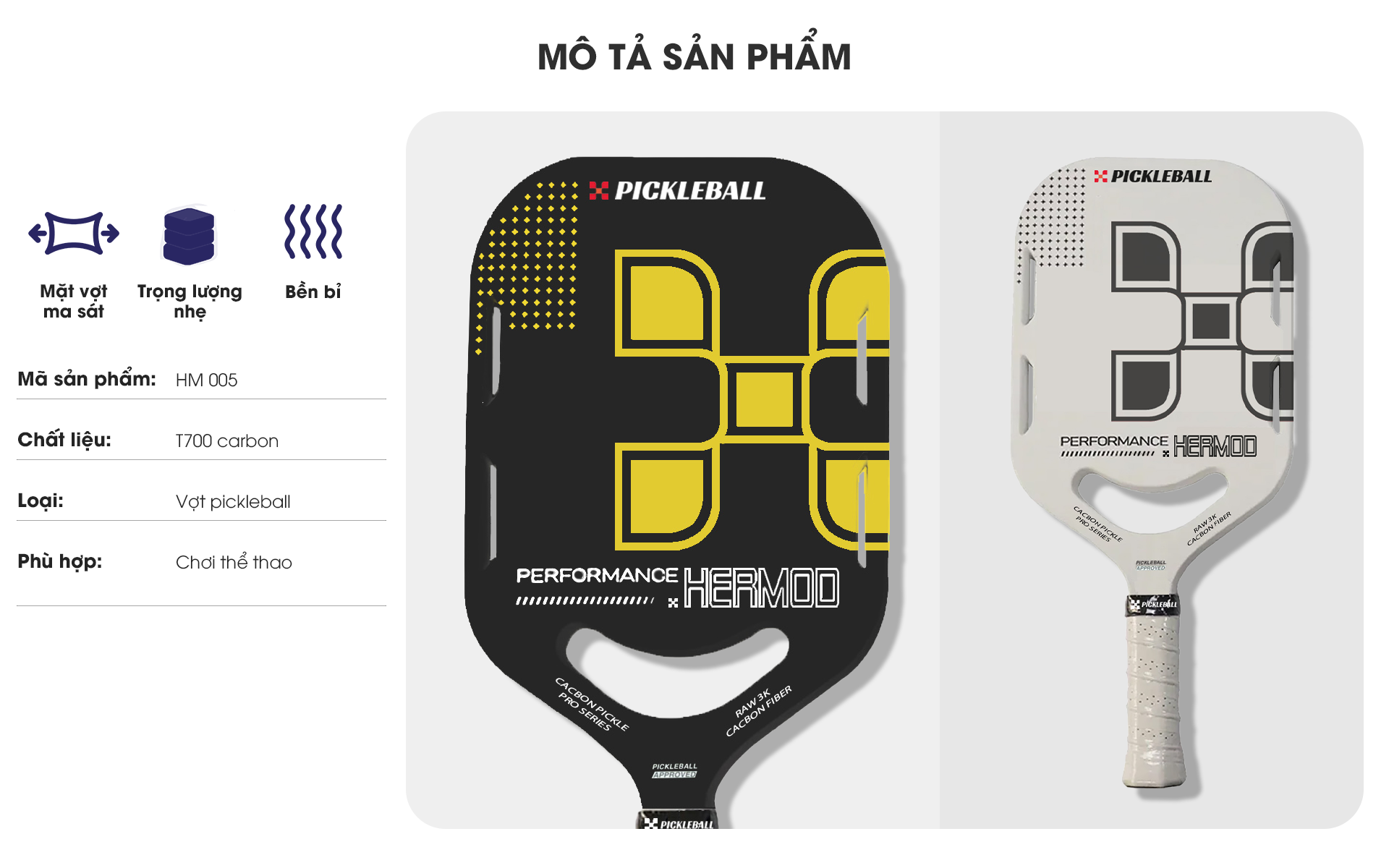Bạn đang tìm kiếm một cây vợt Pickleball với hiệu suất vượt trội, thiết kế tinh tế và công nghệ tiên tiến? HM 005 chính là lựa chọn hoàn hảo cho những tay vợt yêu thích sự chính xác, tốc độ và đẳng cấp trên sân đấu.